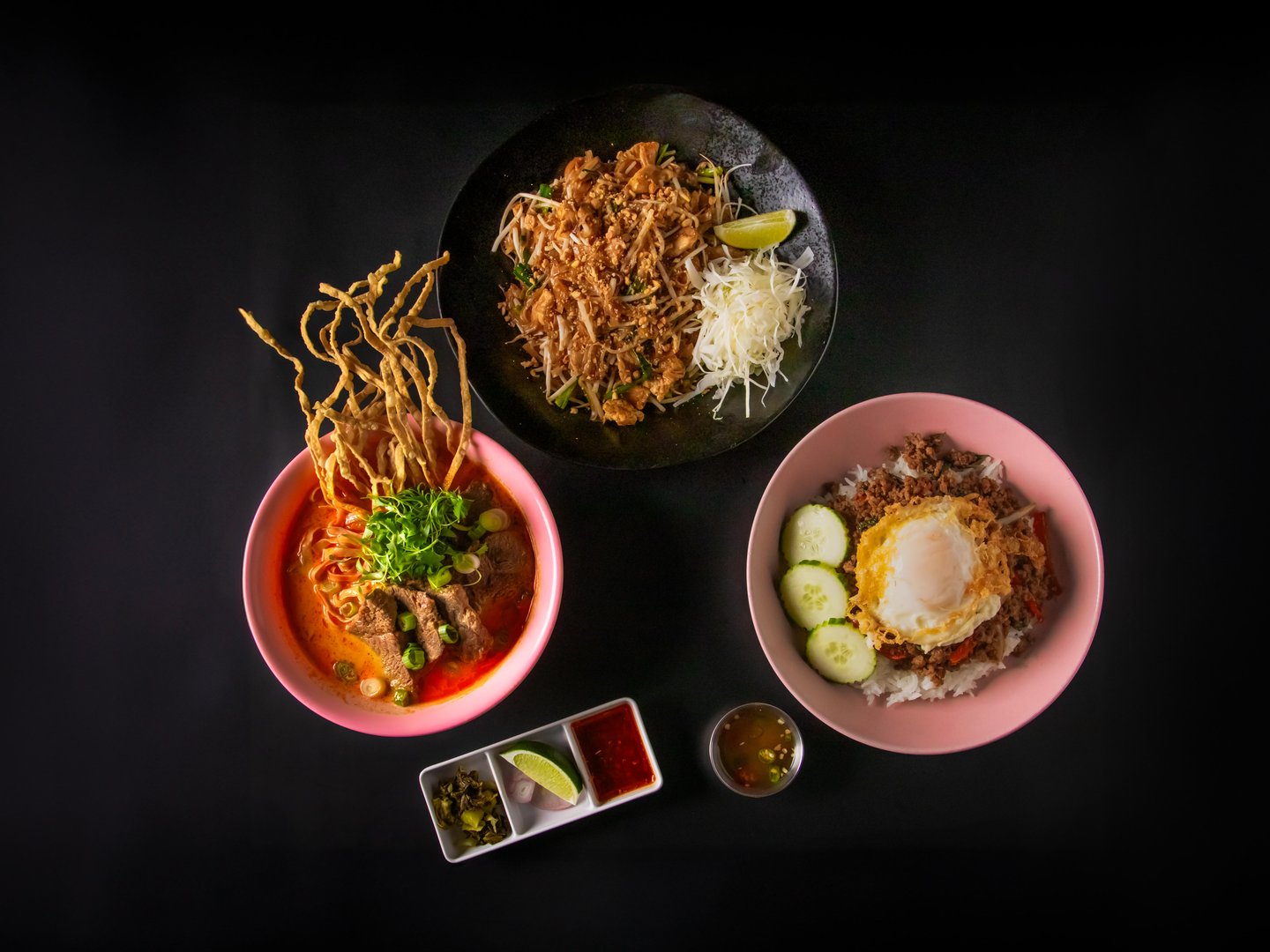 Fried rice with Thai garlic, Chinese broccoli, tomato, egg, and your choice of protein. Topped with coriander. Served with cucumber, lime, and nam prik nam pla sauce (fish sauce, garlic, chilli & lime) on the side. Your choice of Beef, Chicken, Tofu & Veggies, or Shrimp. (Contains, egg, fish sauce, gluten, mushroom, oyster sauce, soy) *Gluten-free, or vegan available upon request*